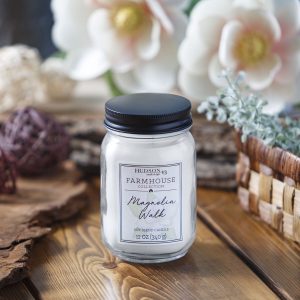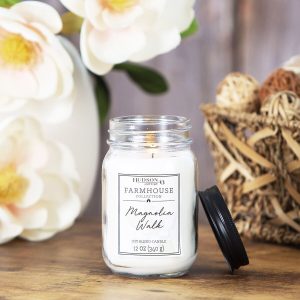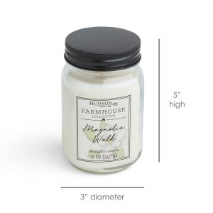 The Hudson 43 Farmhouse Collection Magnolia Walk Mason Jar Candle offers a modern yet rustic fragrance in a beautiful package that goes with any decor. This 12-ounce clear mason jar comes with a white wax candle and a matte black lid that screws on. It includes the notes of delicate magnolia petals.