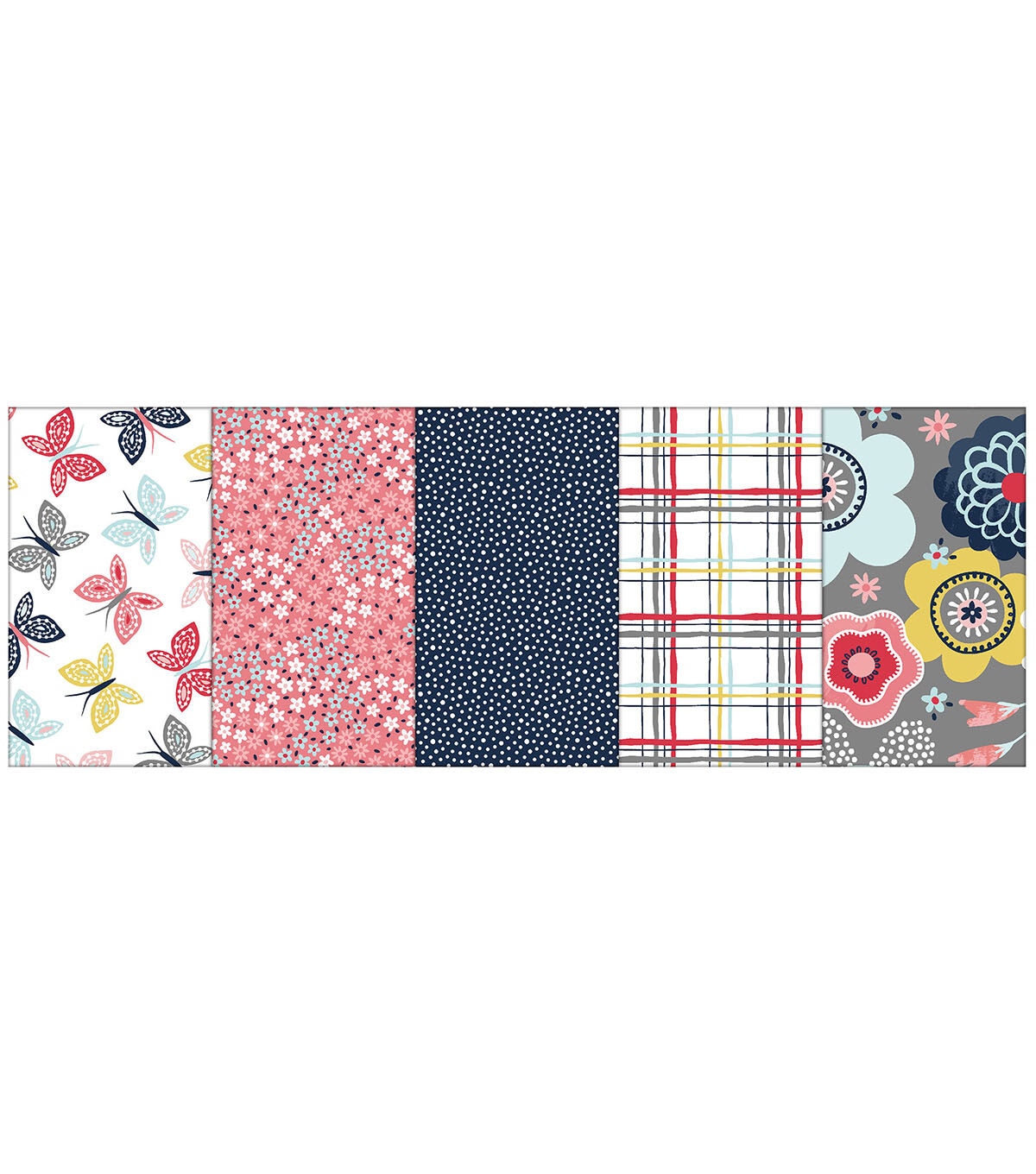 Colorful butterflies, bright flowers, and a whimsical plaid highlight this 5 piece Fabric Quarter Bundle.