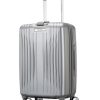 - Handles: Soft-touch, dual-stop pull handle with flush button for comfortable mobility, iconic leather-wrapped top carry handle
