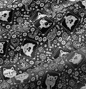 Bring out your playful side with the Fabric Traditions Bandana Cats on Black Novelty Cotton Fabric. This fabric is perfect for creating fun and unique projects that are sure to stand out. The black background provides a perfect canvas for the adorable cat bandanas that are scattered throughout the fabric. The playful design is perfect for creating a variety of projects, from clothing to home decor.