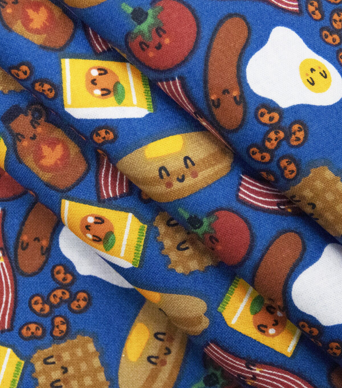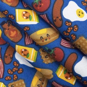 Happy Breakfast Foods on Blue Novelty Cotton Fabric