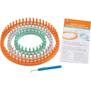 The Knitting Board Premium Chunky Yarn Round Loom Set contains three chunky round looms with 48, 36 and 24 pegs in large 0.63-inch gauge. They work great with chunky to super bulky weight yarns. Each loom is made of high-grade plastic and stay-put pegs, specifically engineered to work smoothly with yarn. These looms are great to create hats, scarves, shawls, home decor and much more.