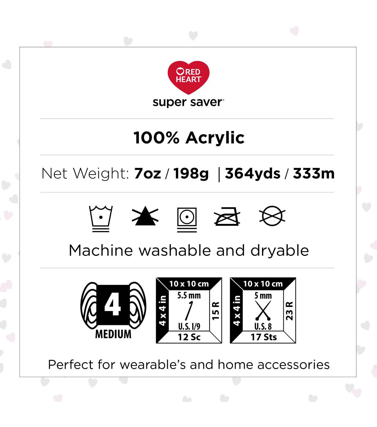 Super Saver yarn has been a favorite among knitters and crocheters for over 30 years. This 100% acrylic worsted weight, size 4 yarn comes in over 120 beautiful colors, so you will always find the perfect color to complete your project. No-dye-lot solids mean all skeins of a solid color match, so it’s easy to buy another skein and continue the project. Plus after you make your project it will be made to last, as Red Heart Super Saver yarn is durable and will stand the test of time, wash after wash. This product holds the OEKO-TEX Standard 100 certification.