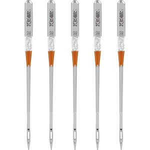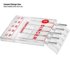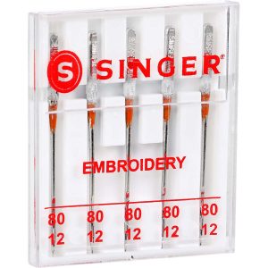 SINGER machine embroidery needles offer a smooth sewing experience, thanks to the special scarf and enlarged eyes. Design features decrease friction on thread, avoiding shredding and breakage. Needles are sized 80/11, best used on lightweight woven fabrics. The set of 5 machine embroidery needles comes in a plastic case that includes sizing on the cover.