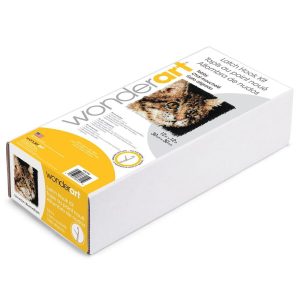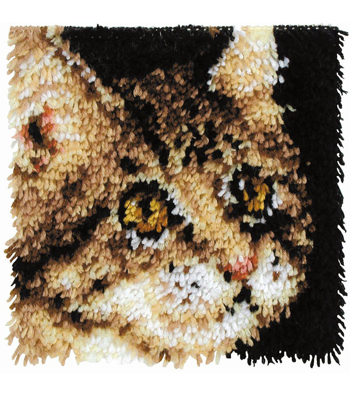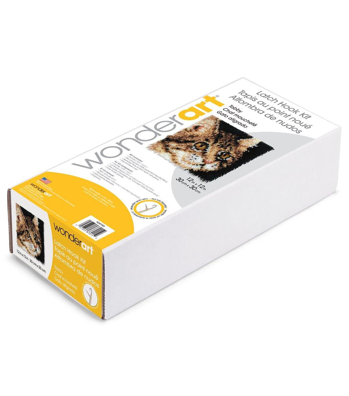 CARON-Wonderart: Latch Hook Kit. This kit will give you a rug that is wonderfully lush and can be made to fit any decor motif. The possibilities are astounding, you can use them on the floor, wall, sofa, bed, window or even make them into pillows, nap-mats and seat cushions. They are easy to make, it would be a wonderful family project! This kit contains a 50% polyester/50% cotton canvas, pre- cut rug yarn, illustrated how to latch hook instructions and an easy-to-follow chart. Hook tool and binding materials are not included. Size: 12x12in. Design: Tabby. Made in USA.
